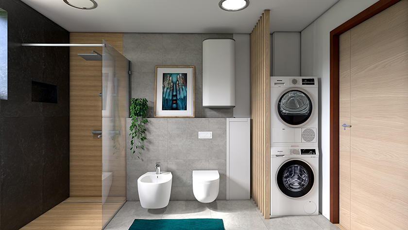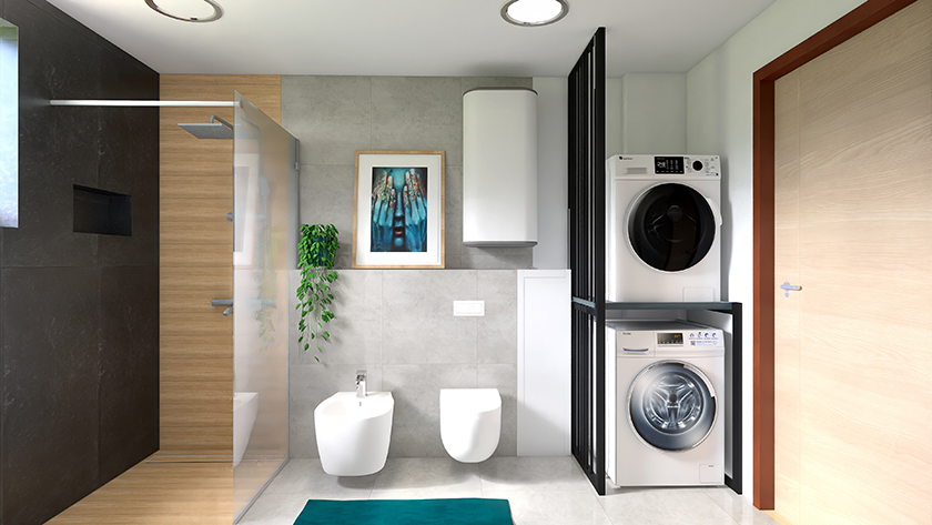 Osnovna funkcionalnost ovako postavljenog seta dva prijeko potrebna uređaja je neupitna i cilj joj je ušteda prostora kada je to potrebno. Jednostavno ih postaviti tek jedan na drugi i povezati veznim elementom u kupaonici ili odvojenom vešeraju je svakako opcija, ali ne bi dizajnersko srce bilo mirno s takvim rješenjem kraj svih dostupnih mogućnosti za podizanje estetike i funkcionalnosti prostora. U nastavku donosim primjer iste kupaonice s nekoliko različitih varijanti koje su cjenovno i izvedbeno različite. Situacija je ponešto zahtjevna jer se u kutu nalazi izbočenje.