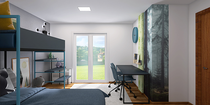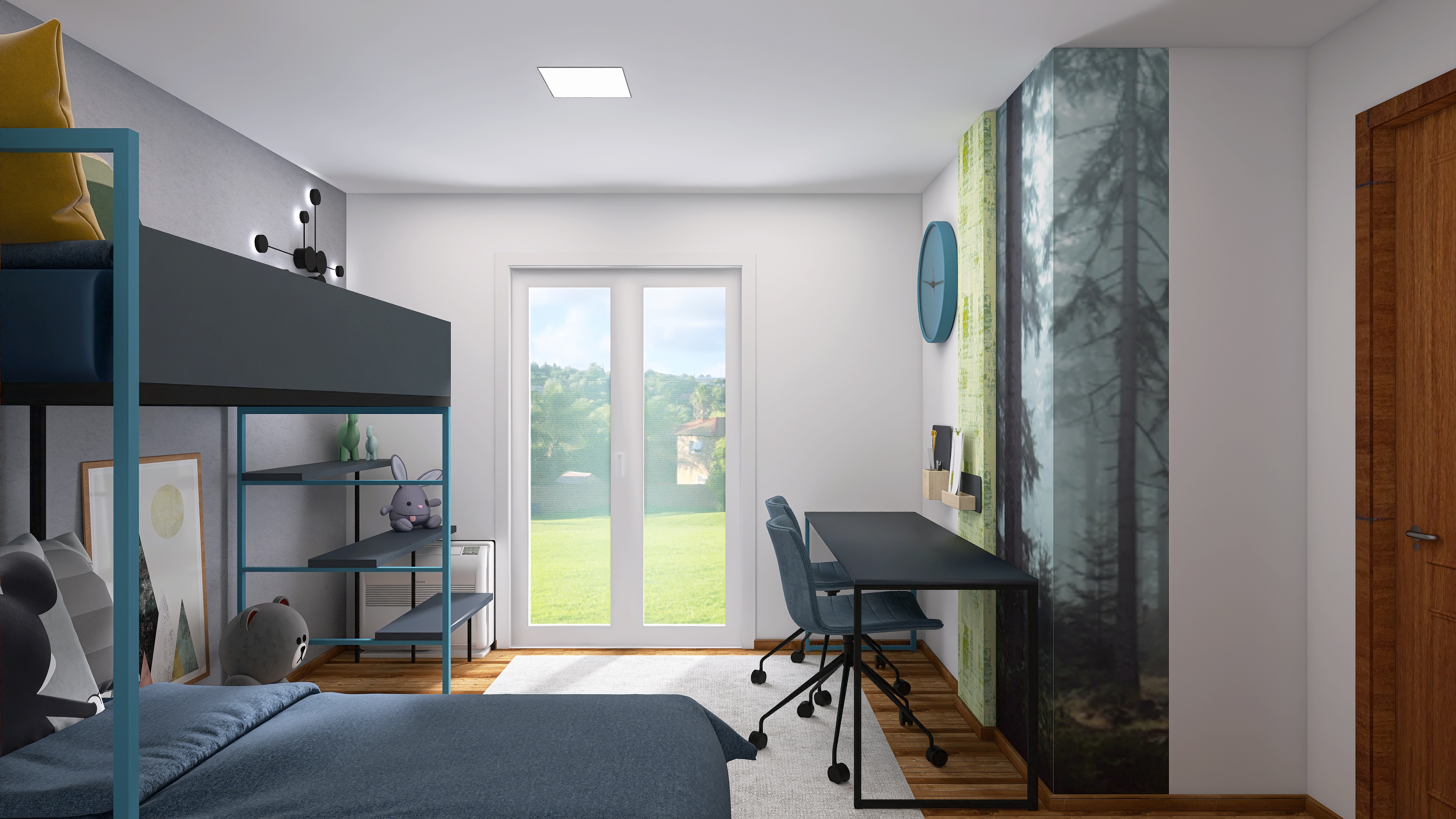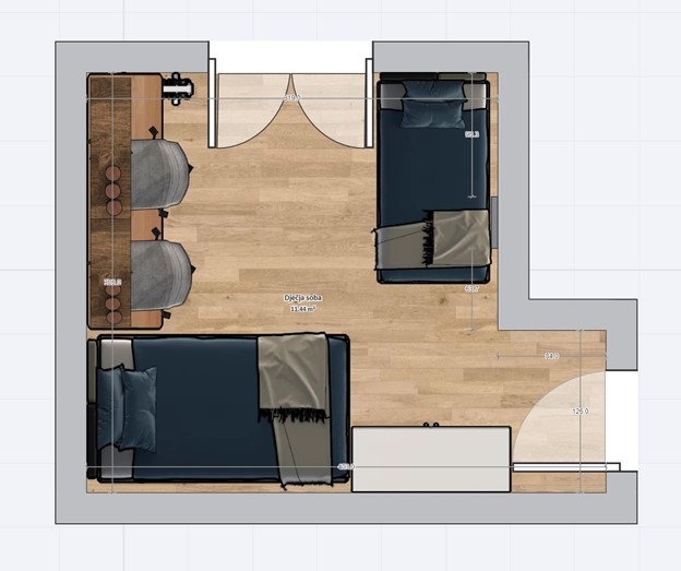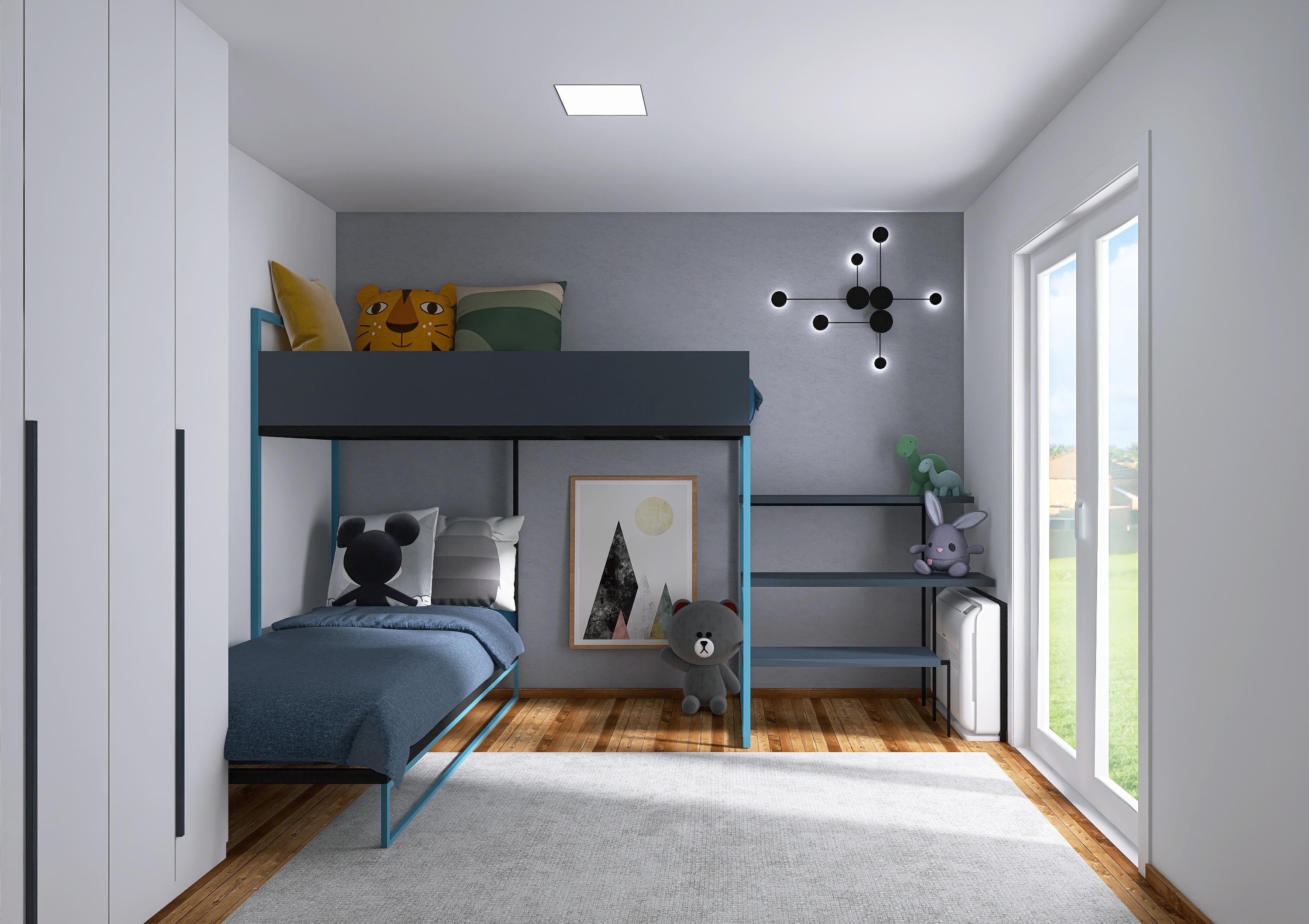 Smještanjem kreveta na kat po mjeri pokraj balkonskih vrata, otvara se mogućnost dodavanja još jednog elementa u prostor poput police za knjige ili većeg garderobnog ormara te izdašne radne površine od zida do zida. Budući da su dječaci predškolarci, taj prostor se do polaska u školu može jednostavno urediti u prostor za igru, a naknadno dodati radni stol po mjeri sa stolicama za učenje. Ovdje je zadržan postojeći ormar.