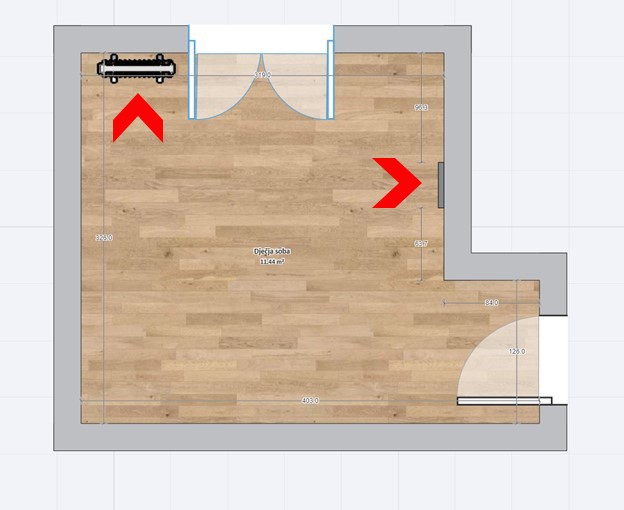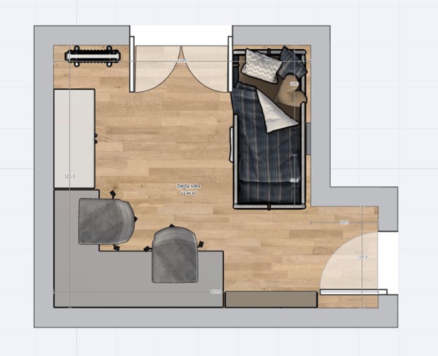 Na sljedećem primjeru želim pokazati mogućnosti ove jednostavne i pristupačne usluge. Radi se o prostoriji s nekoliko situacija koje je potrebno uzeti u obzir kod opremanja, a koja će služiti kao dječja soba za 2 dječaka. Osim zatečenog stanja, klijent želi, ukoliko je moguće, iskoristiti postojeći dječji krevet dimezija 125cm x 205cm te ormar širine 125 cm i dubine 55 cm:
