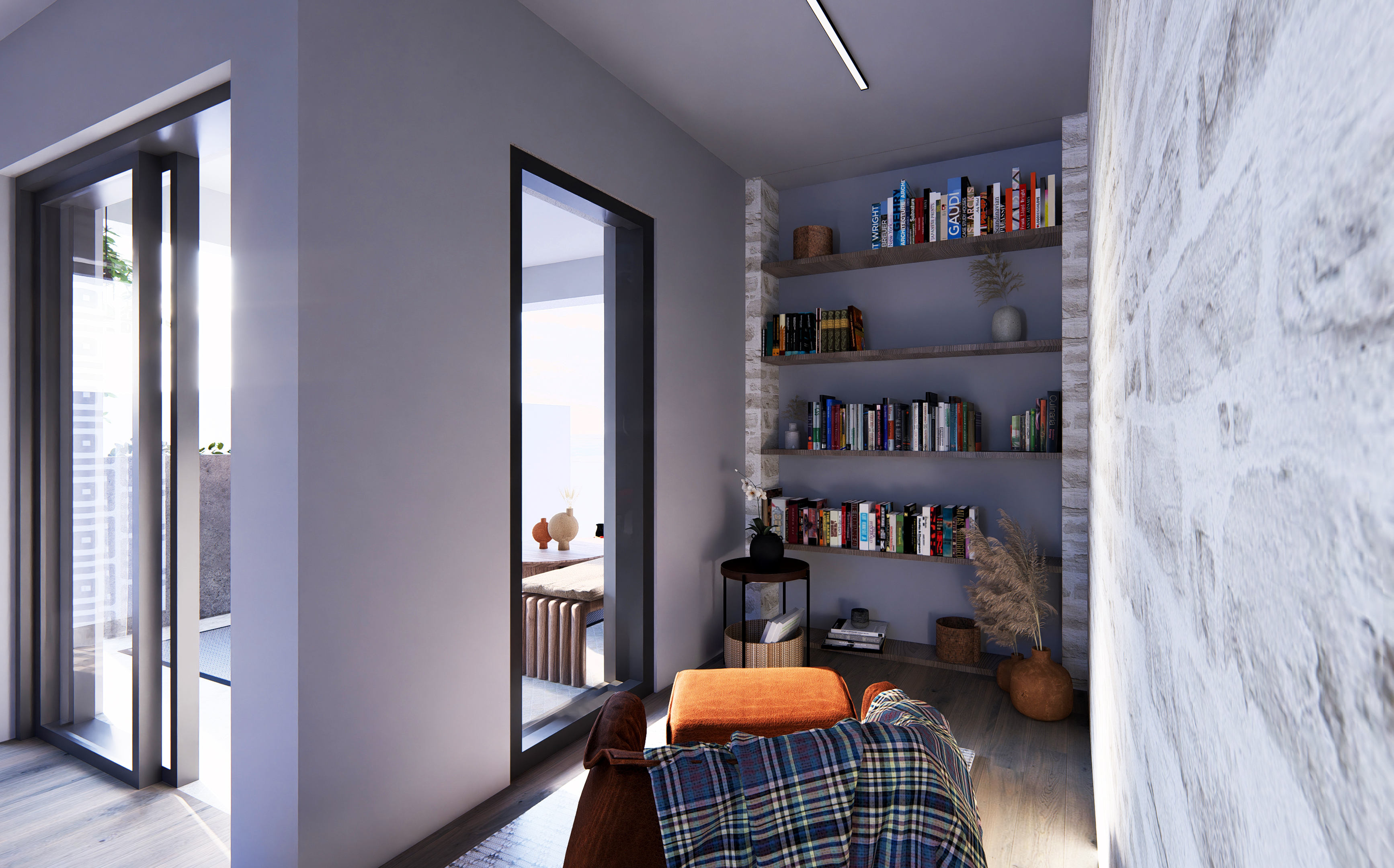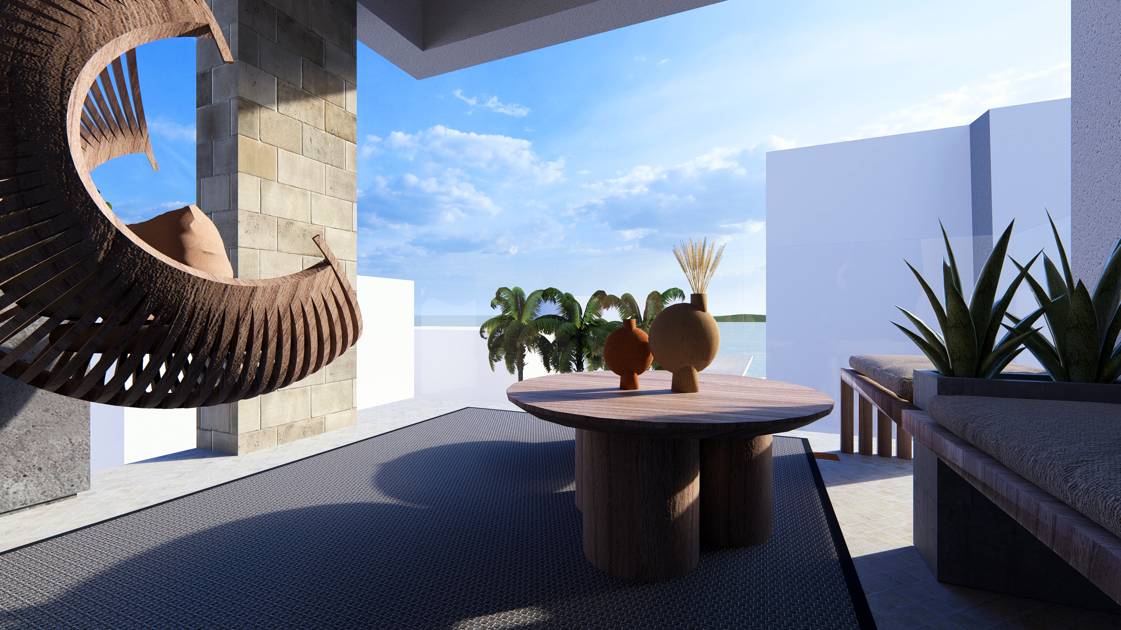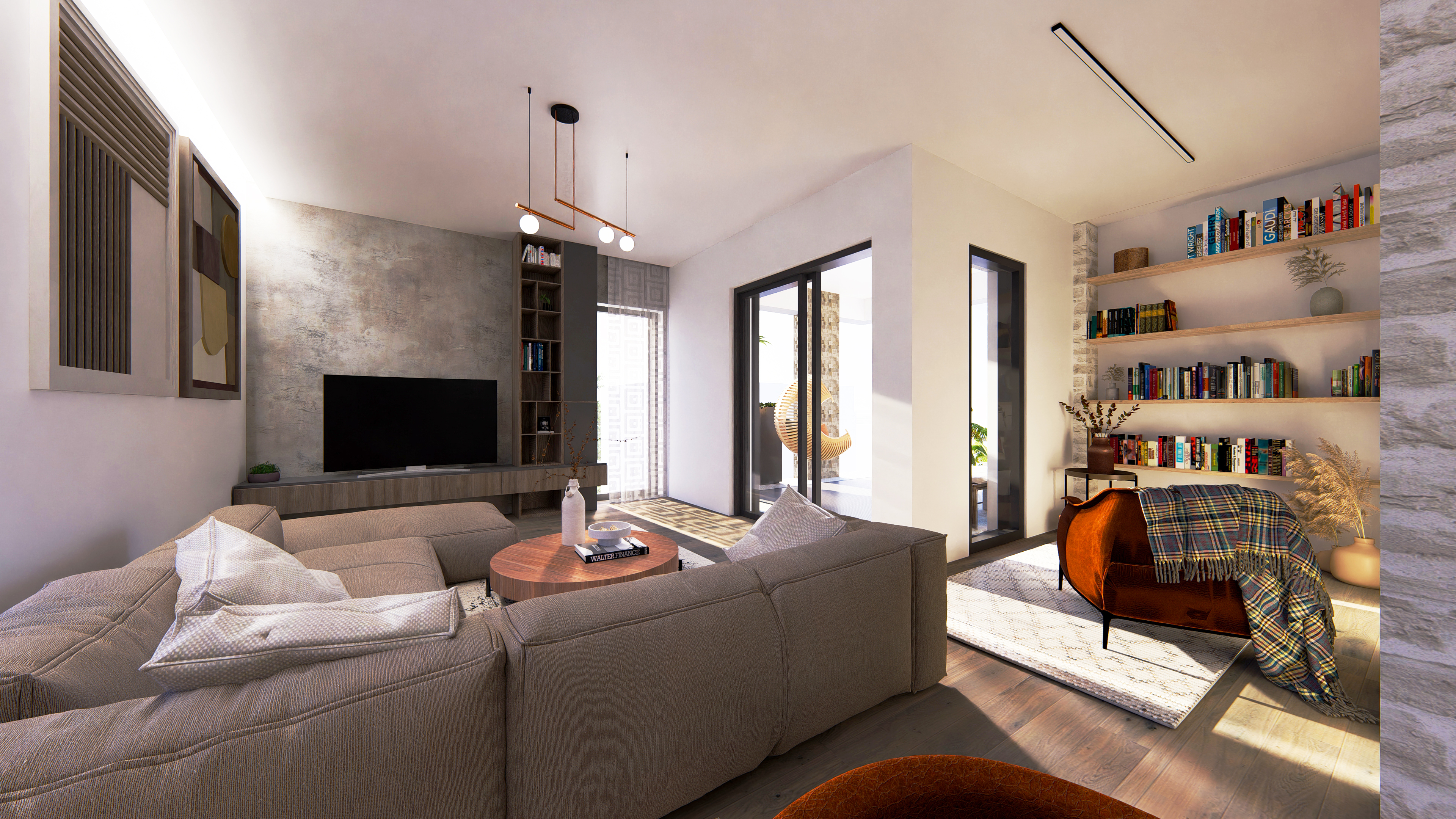 Vizualizacija obuhvaća dnevni open space koji se sastoji od blagovaonice, dnevnog boravka i knjižnice s izlazima na veliki natkriveni balkon s pogledom na more.