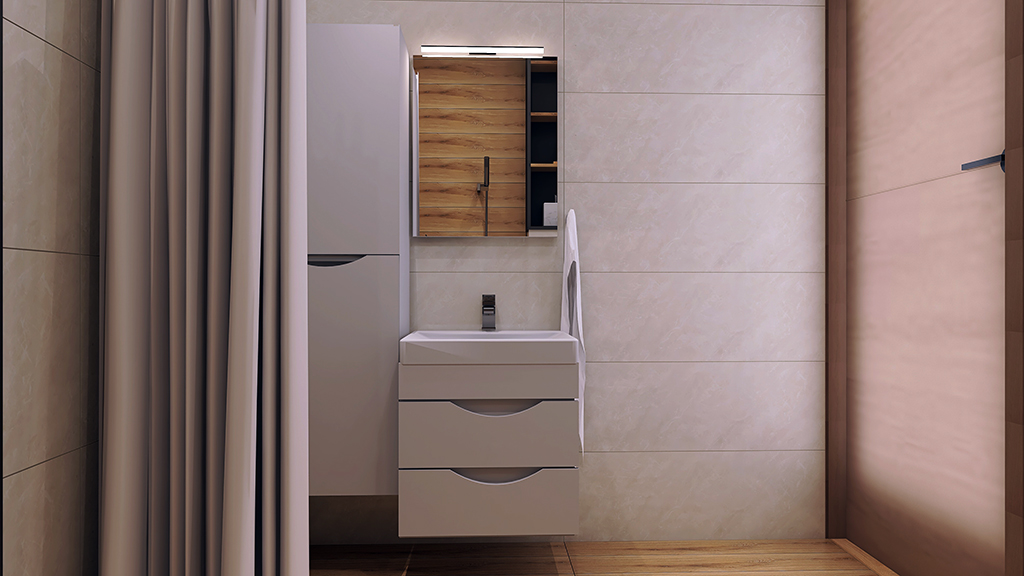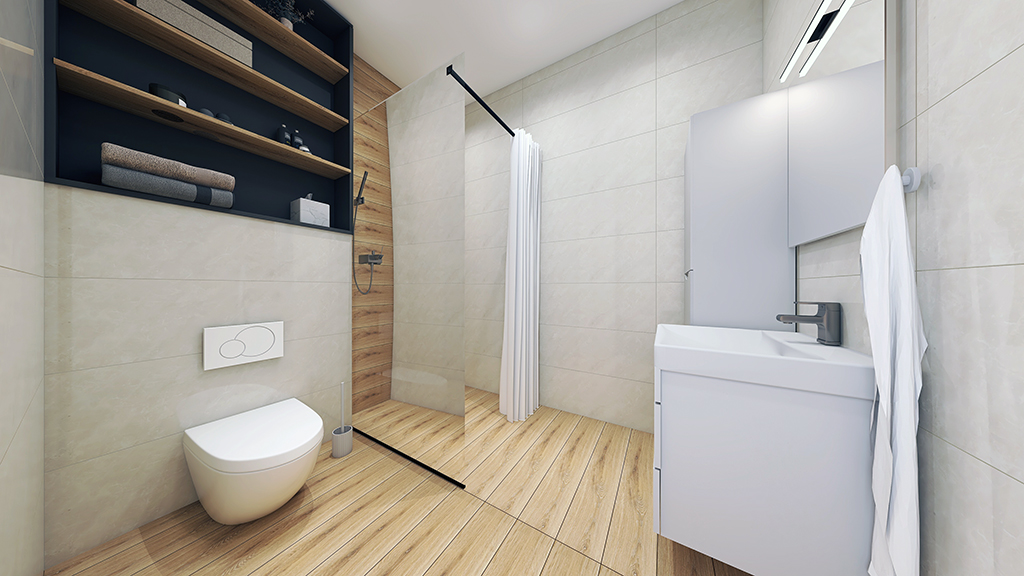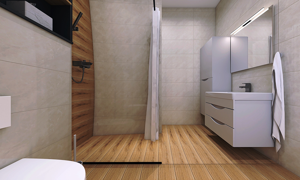 Ova kupaona odlikuje se prvenstveno fukncionalnošću, prilikom renovacije ugrađeno je podno grijanje kao i wc školjka-bide. Bojama pločica postignuto je vizualno odvajanje prostora tuša od ostatka prostora.