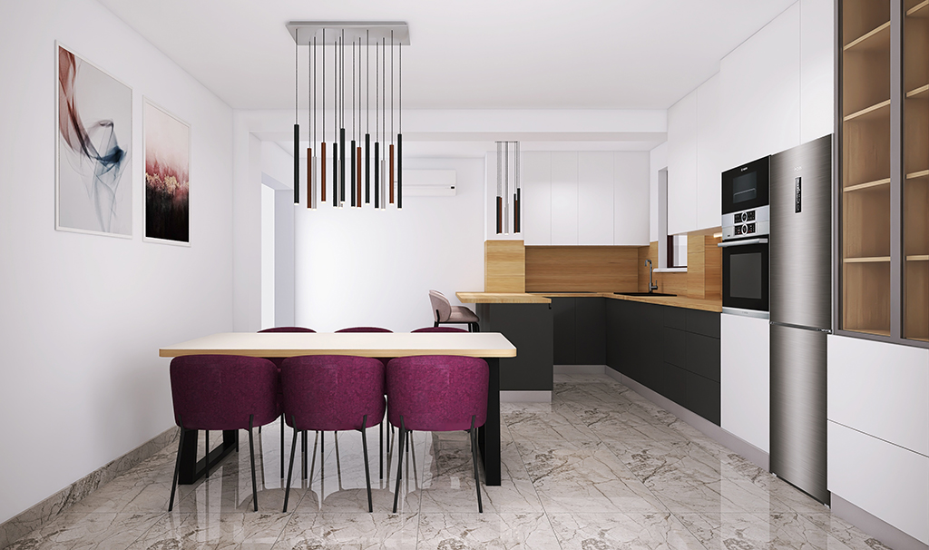 Tijekom kompletne renovacije stana, klijent se odlučio za pomoć oko dizajna nove kuhinje. Zbog uklanjanja nosivog zida, rješenje treba uzeti u obzir novonastale izbočine na stropu i zidovima.