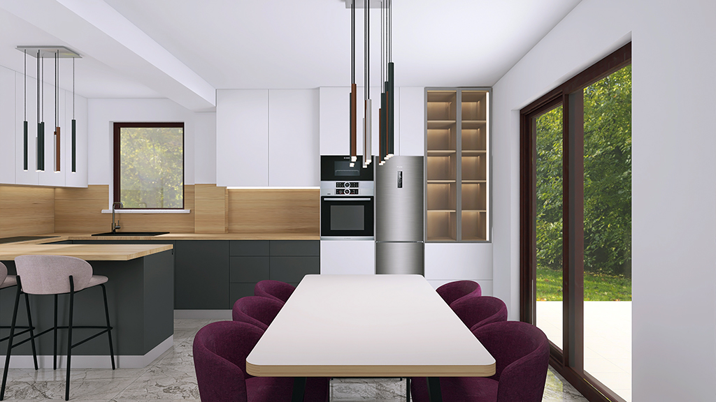 Postojeći prostor je proširen i osmišljena je nova, funkcionalna kuhinja s prostranim blagovaonskim stolom koji prima 6 blagovaonskih stolica, šankom s 3 polubarske stolice i dijelom kuhinje s vitrinom koja služi kao izložbena komoda za drago posuđe. Zbog veličine kuhinje, gornji elementi su izvedeni do stropa kako bi se u budućnosti izbjeglo nakupljanje prašine i potreba za čišćenjem velike i teško dostupne površine. Kuhinja je opremljena kvalitetnim aparatima, sadrži napu, ploču za kuhanje, perilicu suđa, ugradbenu mikrovalnu pećnicu, ugradbenu rernu i frižider visine 180 cm. Kuća u kojoj se kuhinja nalazi smještena je u brižno čuvanoj prirodi i prekrasnoj okućnici, tako da se velikim kliznim vratima otvorio novi izlazak na terasu i pogled na zelenilo i cvijeće.