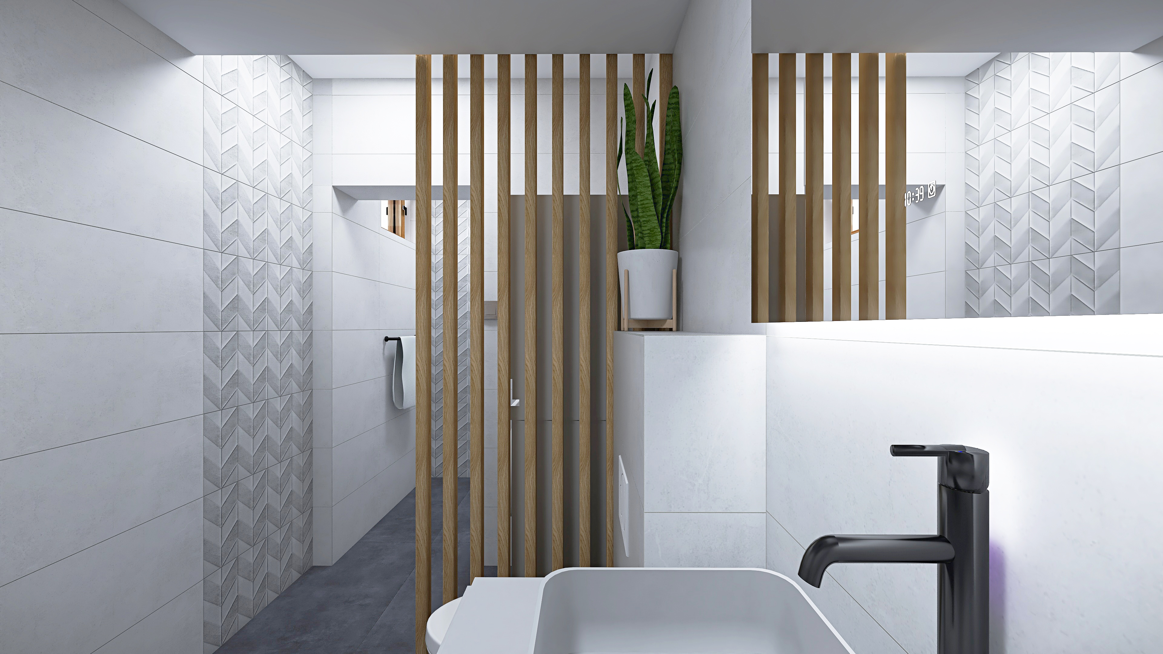 Kupaona je podijeljena na dva funkcionalna dijela, prostor za tuširanje te klasični, kupaonski dio s toaletom. Vešeraj, odnosno, stup perilice i sušilice rublja odvojen je vizualno dekorativnim drvenim letvicama. Renovacija kupaone se odvila tijekom kompletne renovacije stana te se navedena cijena odnosi samo na pločice, sanitarije i kupaonski namještaj, podno grijanje i zidarski radovi nisu iskazani u toj cijeni.