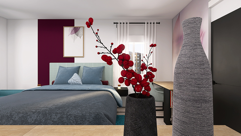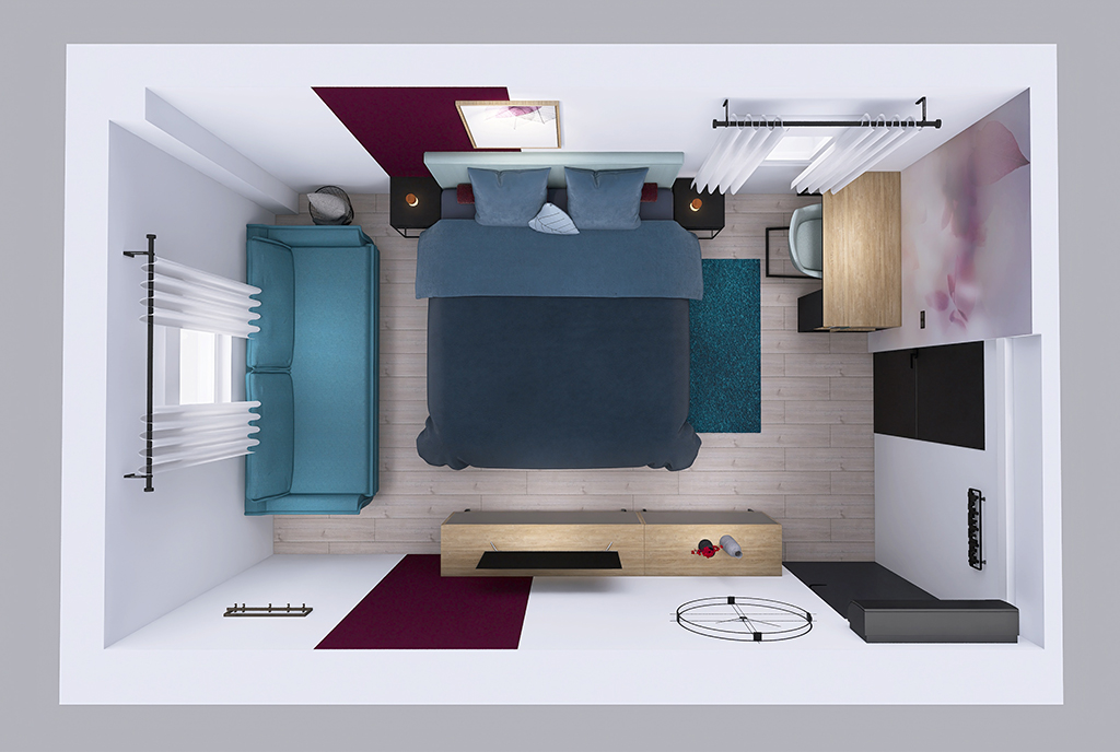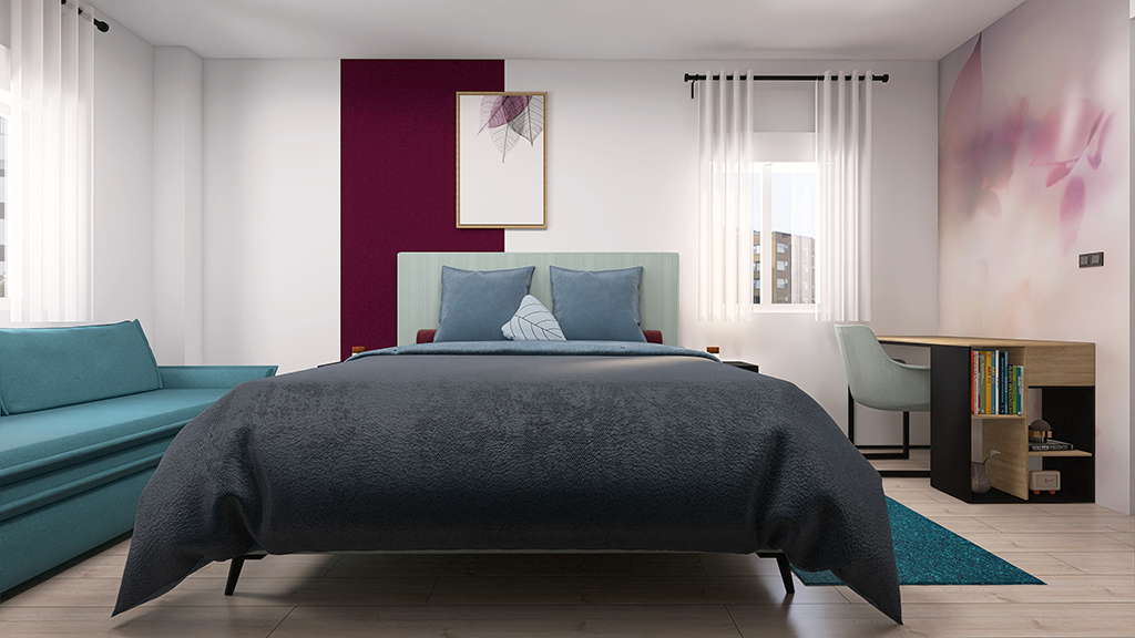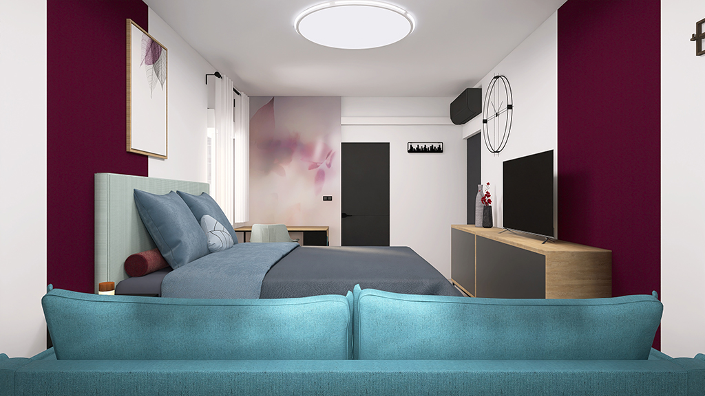 Kako bi se maksimalno osigurala ugodnost boravka gostiju, a poštujući strukturne elemente koji se neće mijenjati (pod i struja) - u sobu će se iznad ulaznih vrata ugraditi klima jedinica jačine 2.5 kW za potrebe grijanja i hlađenja te ugraditi još jedan prozor na istočnoj strani zbog poboljšanja prirodne vetilacije prostorije. Soba će se opremiti potpuno novim namještajem koji se odlikuje prvenstveno udobnošću i kvalitetom. Krevet ima visoki, udobni madrac, a dodatno rješenje za spavanje je kauč na razvlačenje s ugrađenim madracem te s ta dva elementa, soba može ugostiti 4-5 osoba. Soba će imati i kutak s radnim stolom kao i dvije komode za odlaganje posteljine i odjeće koje služe i kao nosač za TV.