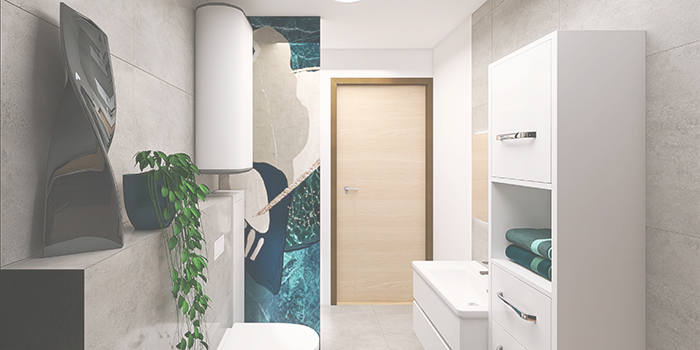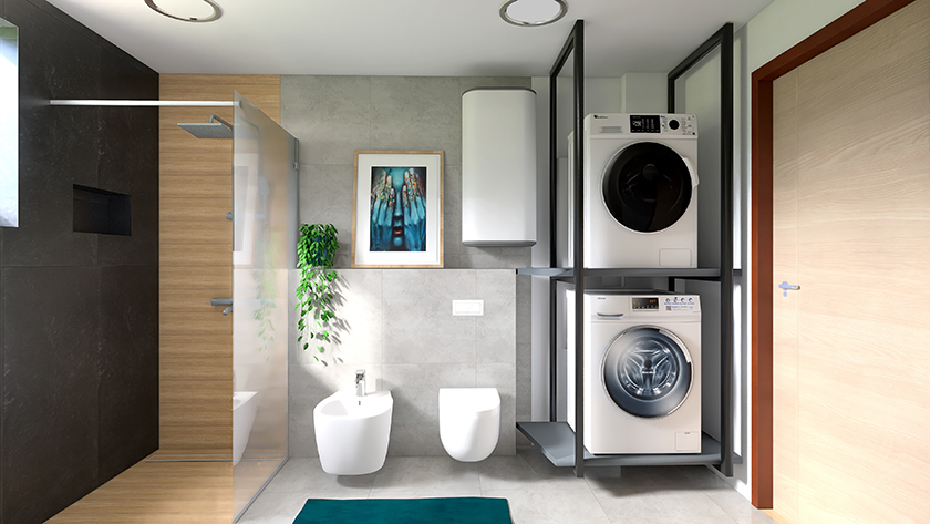 Osnovna funkcionalnost ovako postavljenog seta dva prijeko potrebna uređaja je neupitna i cilj joj je ušteda prostora kada je to potrebno. Jednostavno ih postaviti tek jedan na drugi i povezati veznim elementom u kupaonici ili odvojenom vešeraju je svakako opcija, ali ne bi dizajnersko srce bilo mirno s takvim rješenjem kraj svih dostupnih mogućnosti za podizanje estetike i funkcionalnosti prostora. U nastavku donosim primjer iste kupaonice s nekoliko različitih varijanti koje su cjenovno i izvedbeno različite. Situacija je ponešto zahtjevna jer se u kutu nalazi izbočenje.