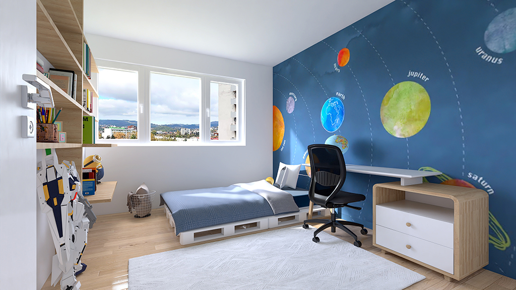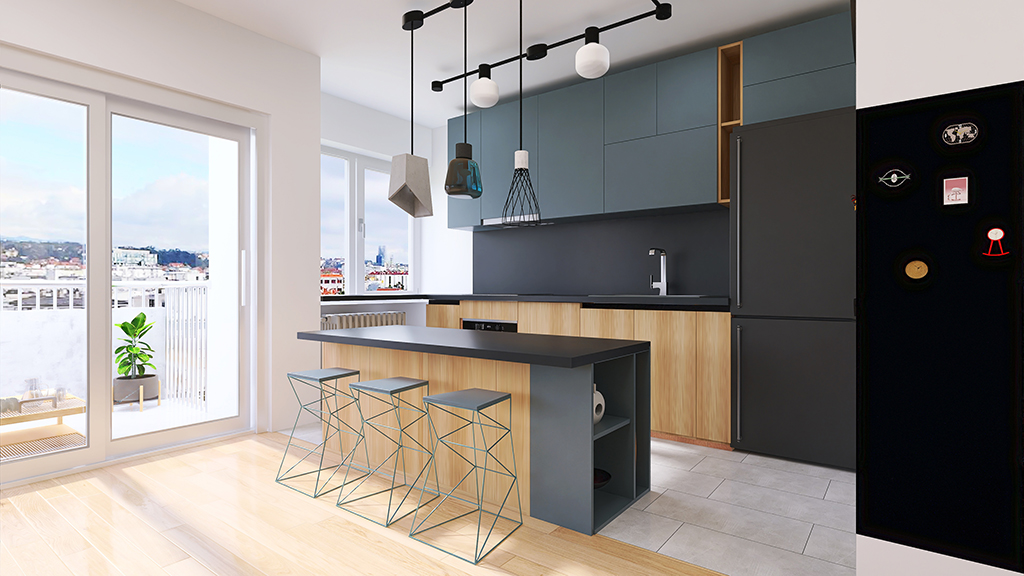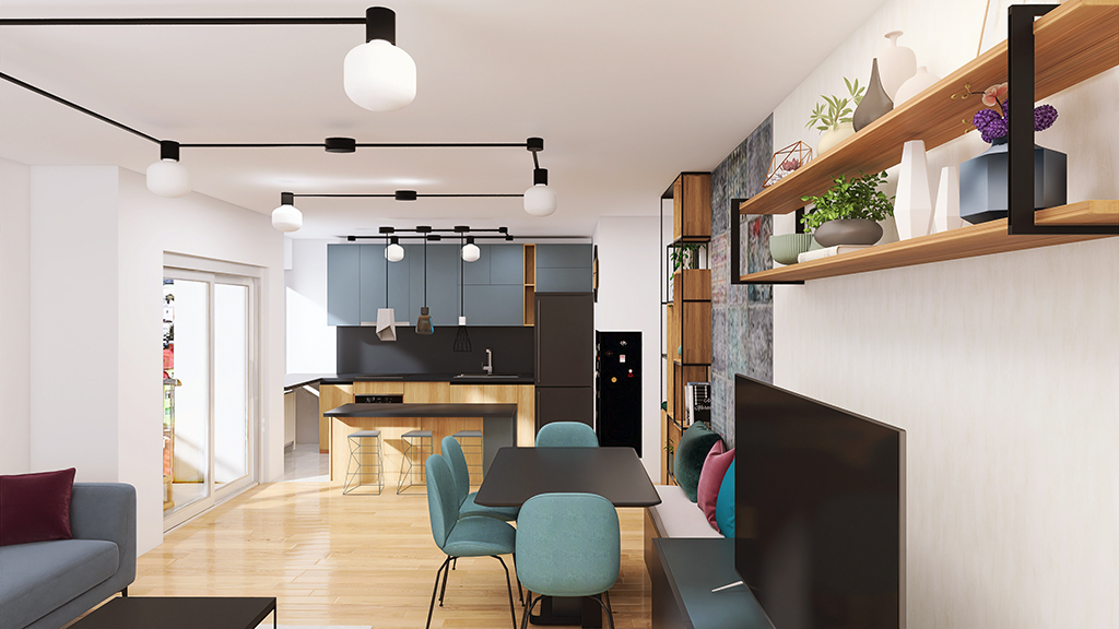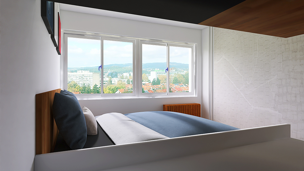 Stan je zadržao dvije spavaće sobe, s manjim pomicanjima i uklanjanjem zidova dobio se veliki otvoreni dnevni dio s kuhinjom. U budućnosti moguće je dobiti treću spavaću sobu s manjim potrebnim preinakama. Izvedene su dvije kupaonice, jedna s tušem i školjkom, druga sa školjkom i perilicom rublja čime je znatno podignuta kvaliteta života u stanu. S obzirom da se stan nalazi na 9om katu nebodera, pogledi kroz prozore su najljepša dekoracija u svim godišnjim dobima.